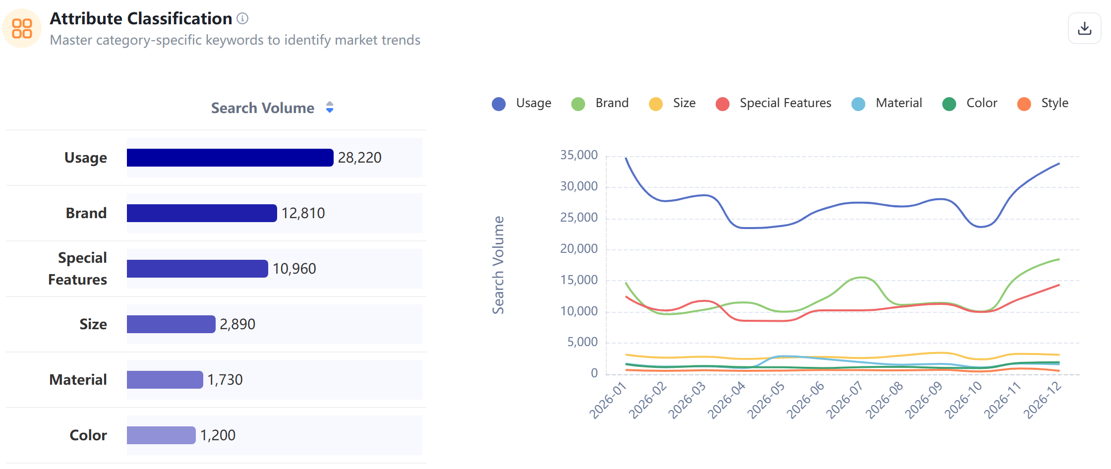 You will see every specific value under that category (e.g., Teal, Matte Black, Rose Gold) alongside its search volume trend. This allows you to visualize exactly how consumer preferences are evolving in real-time.