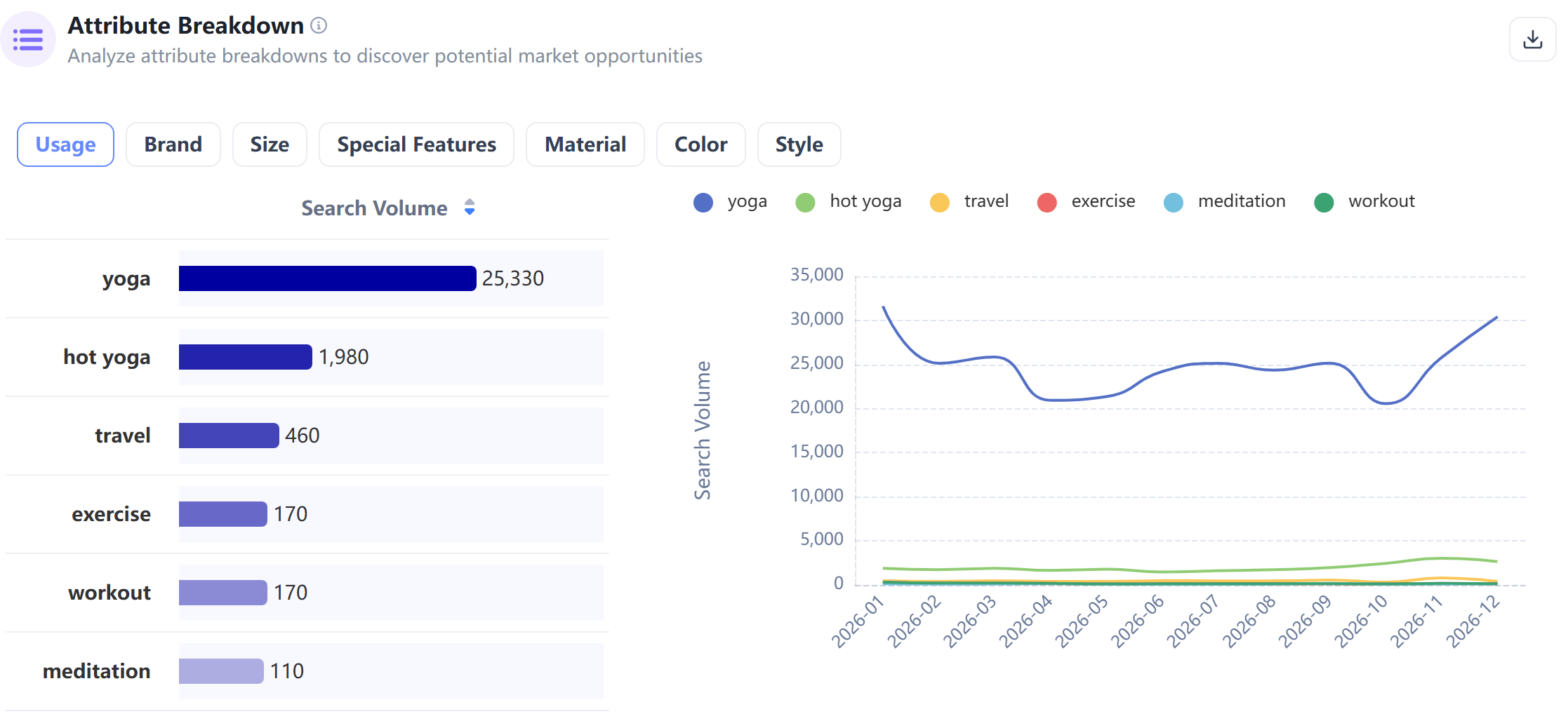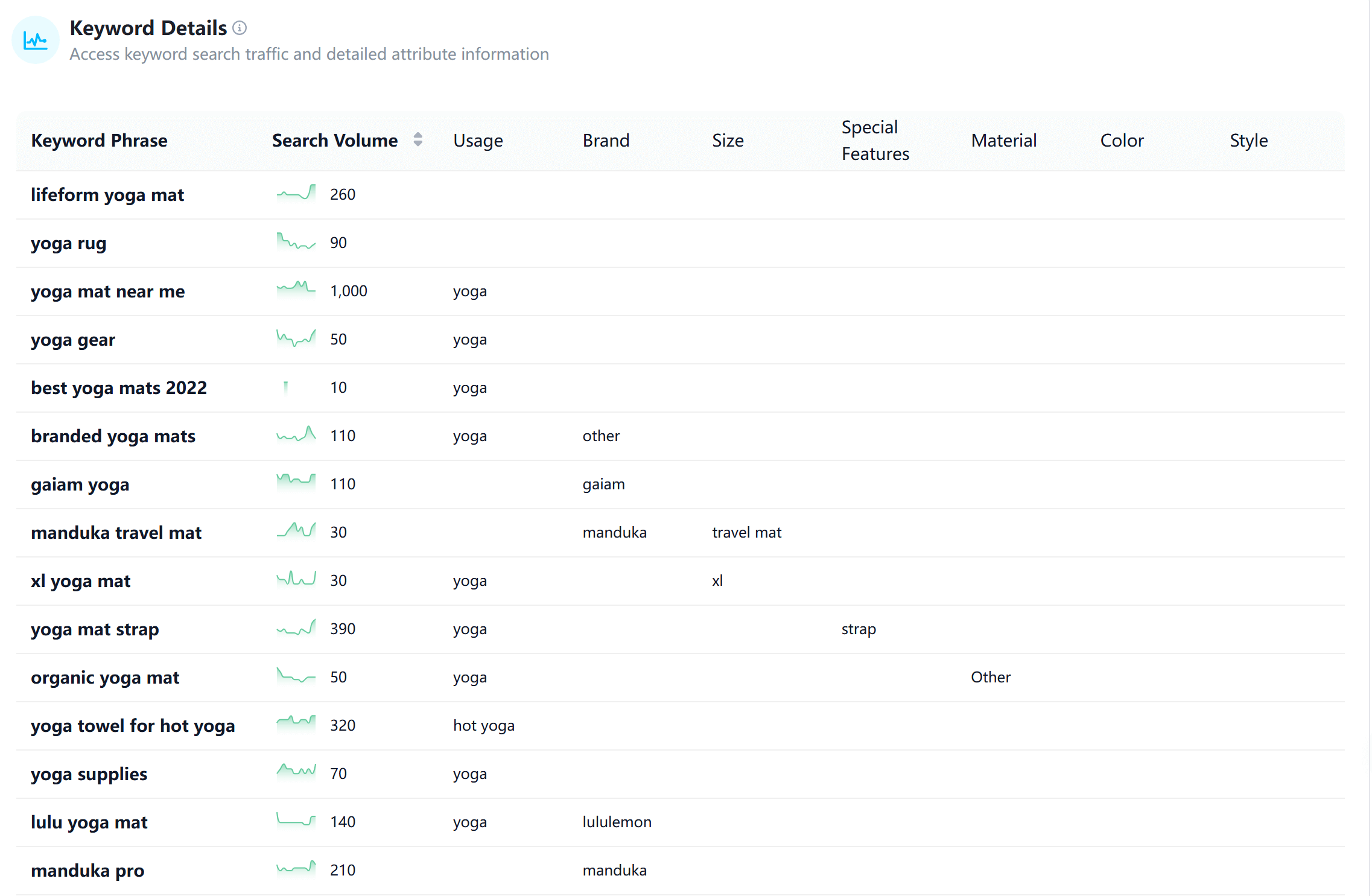 Take the "yoga mat" analysis as an example. You will see a clear distribution of keywords across critical attributes, including: