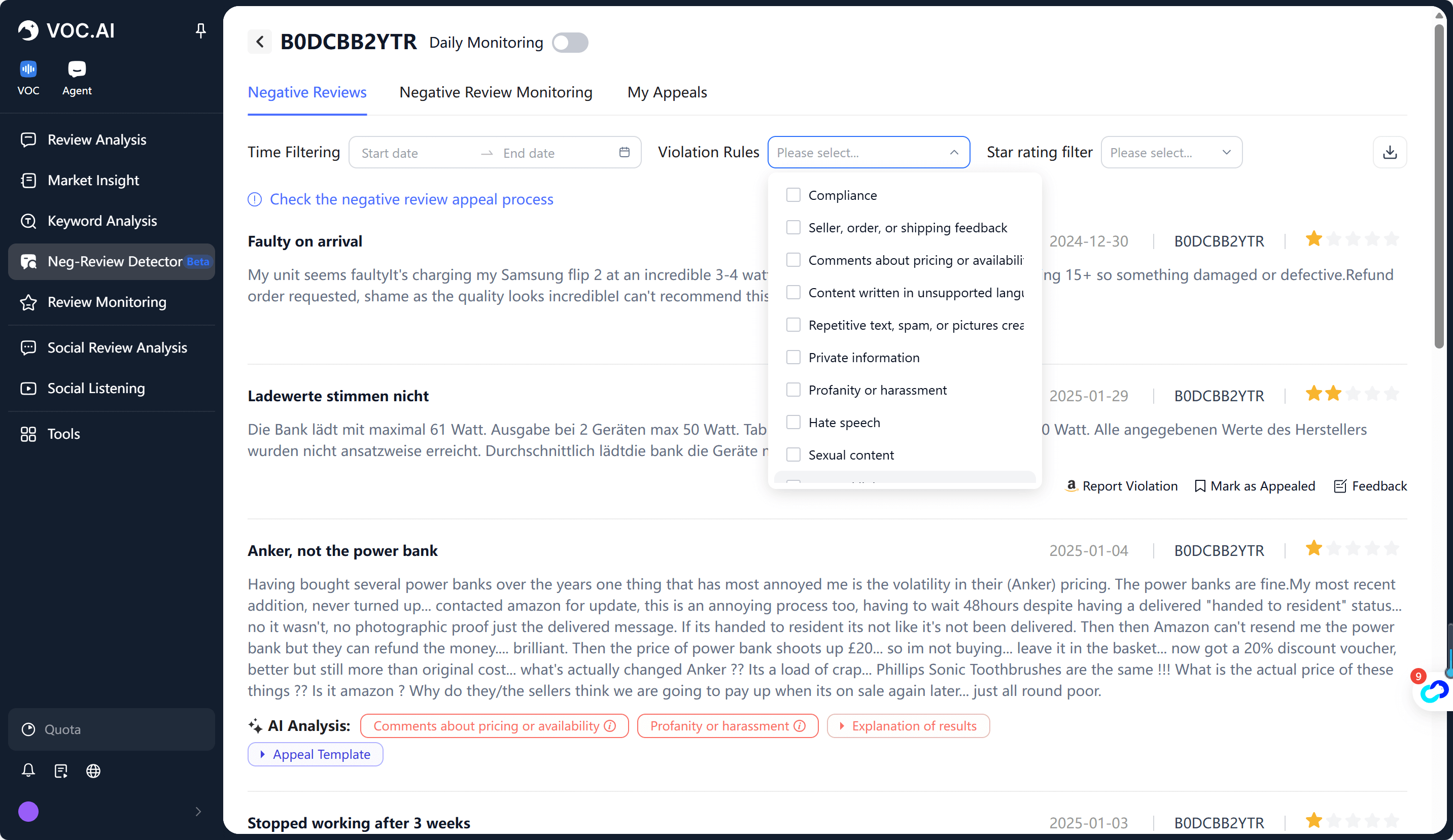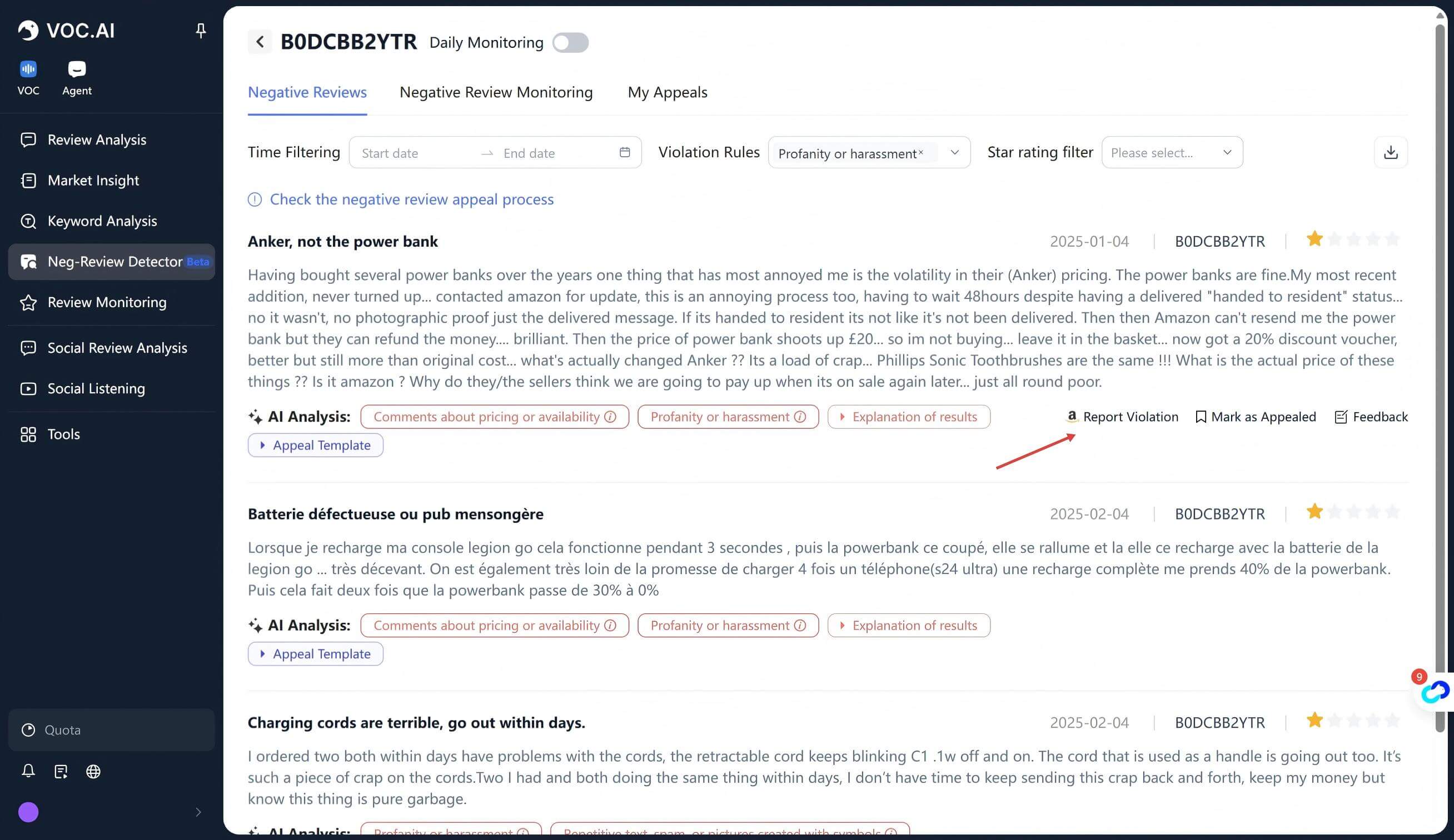 VOC AI has pinpointed the exact text within the review that constitutes a violation, which serves as crucial evidence for your appeal.