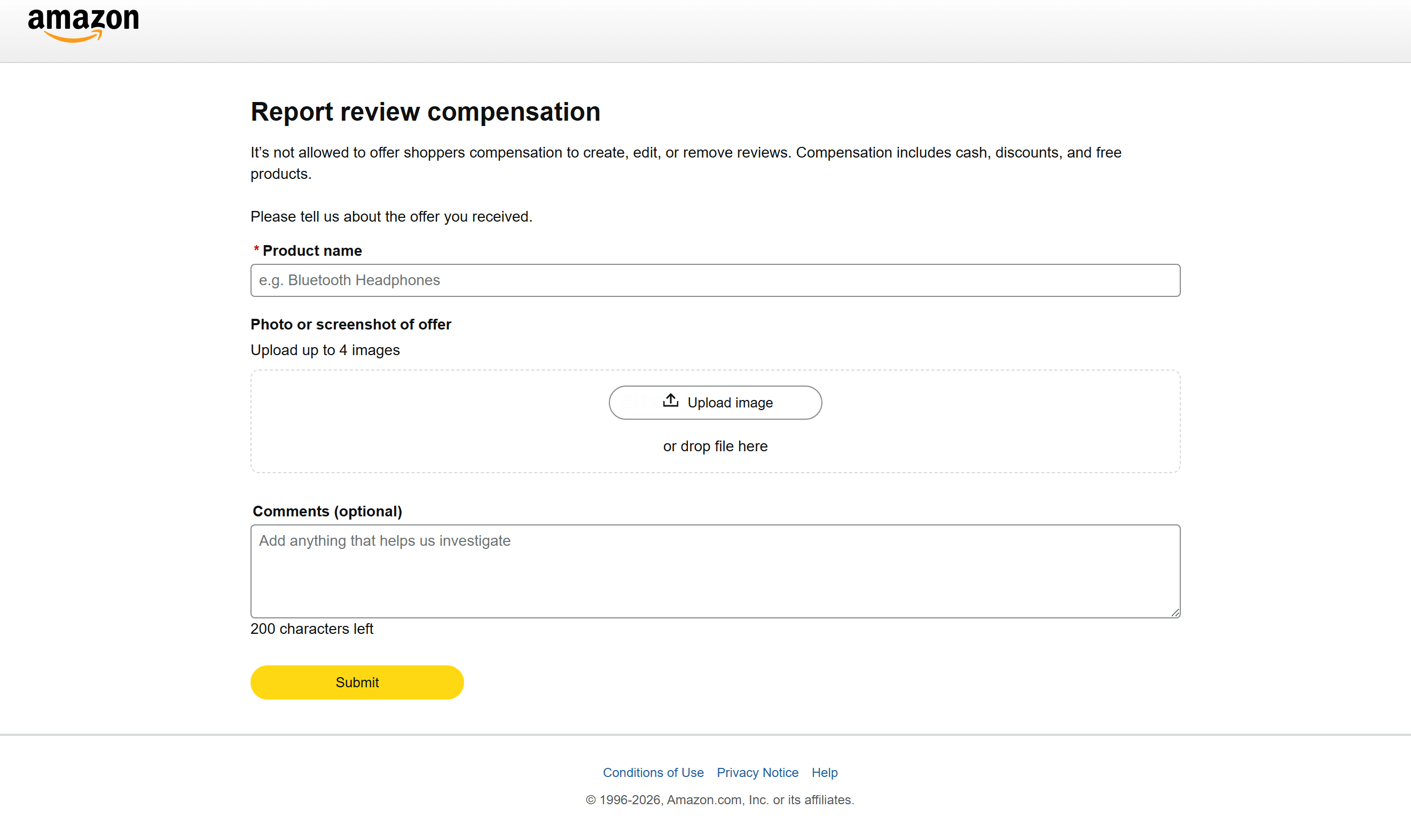 Note: Although this page is titled "Report review compensation" and states, "It’s not allowed to offer shoppers compensation to create, edit, or remove reviews. Compensation includes cash, discounts, and free products," experience with Amazon store operations suggests that this page can also be used to appeal violation types mentioned in the Amazon Community Guidelines. We recommend using a standard buyer account to log in and submit the appeal.