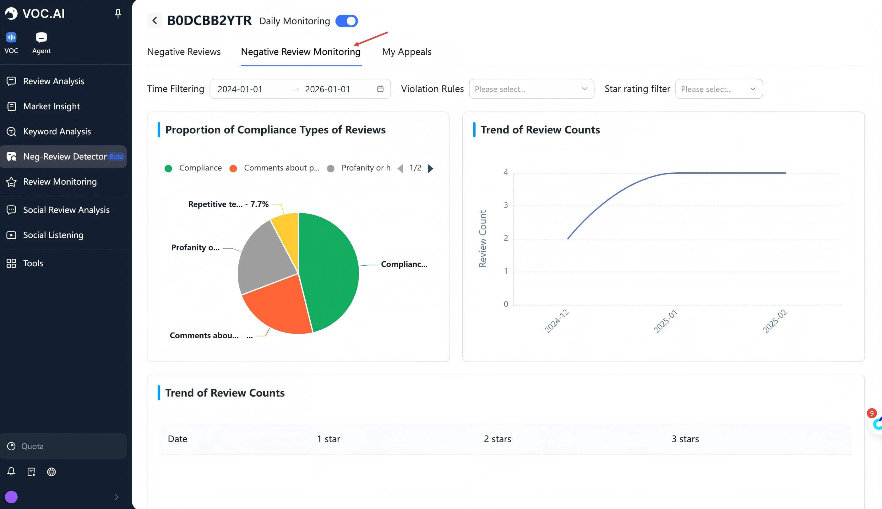 Click [Daily Monitoring] in the top-left corner of the page to activate daily negative review monitoring. Once enabled, VOC.ai will schedule daily crawls to detect new negative reviews and automatically analyze them for violations.