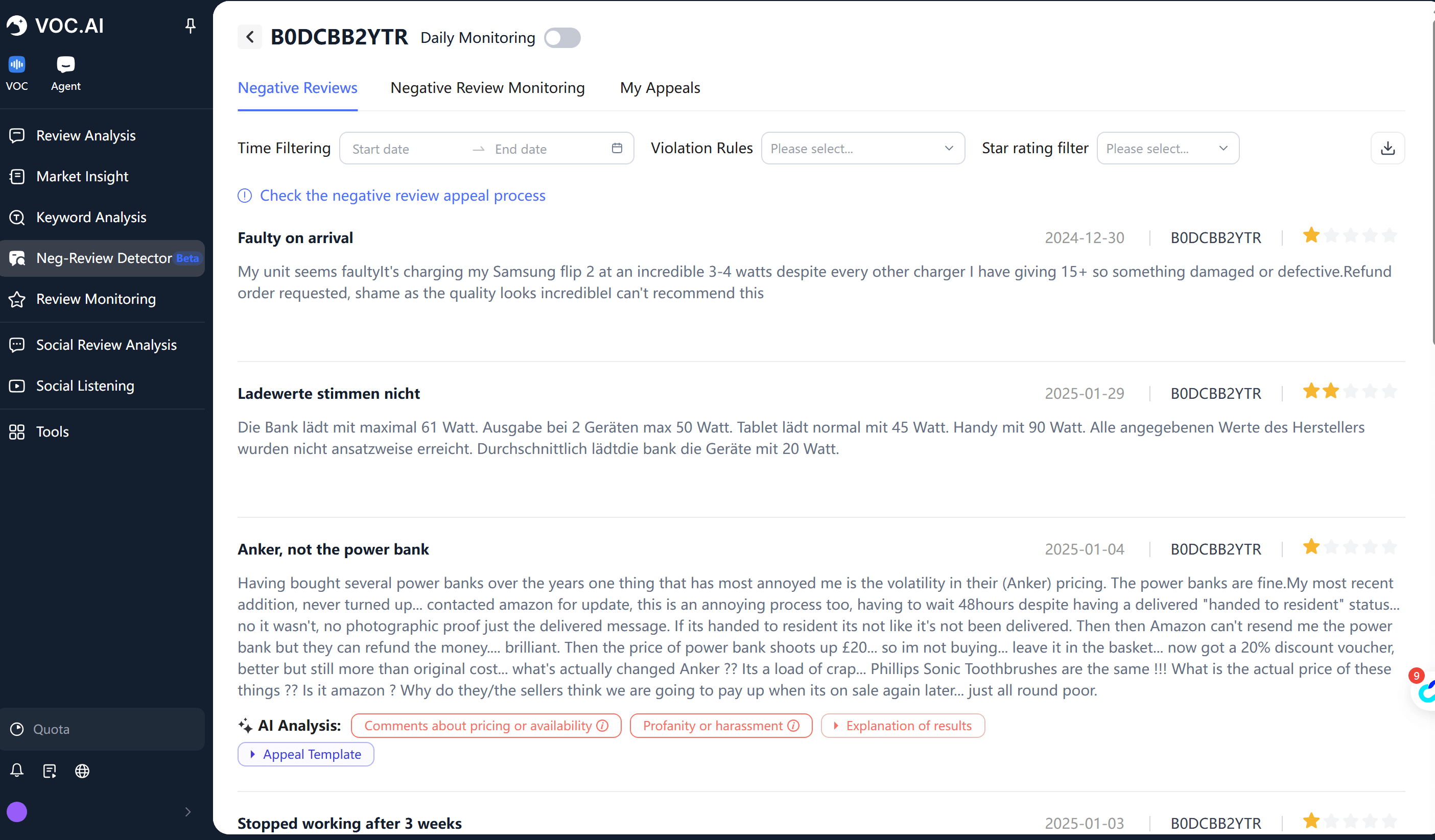 To solve this, VOC AI has officially launched its advanced Negative Review Monitoring feature. Building upon our core "Review Compliance Analysis," we have engineered a full-cycle automated closed-loop—integrating real-time monitoring, AI identification, root cause analysis, and reporting. This update empowers sellers to shift from "putting out fires" to "strategic early warning."
